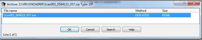 El header se ve correcto de un archivo comprimido (PK) , sin embargo notamos algo extraño , adentro trae un archivo ejecutable como se puede ver en la sección de código ASCII ” Scan001_004819_037. exe” , esto no puede ser bueno ya que contiene un archivo ejecutable, ahí está la primera sospechosa.