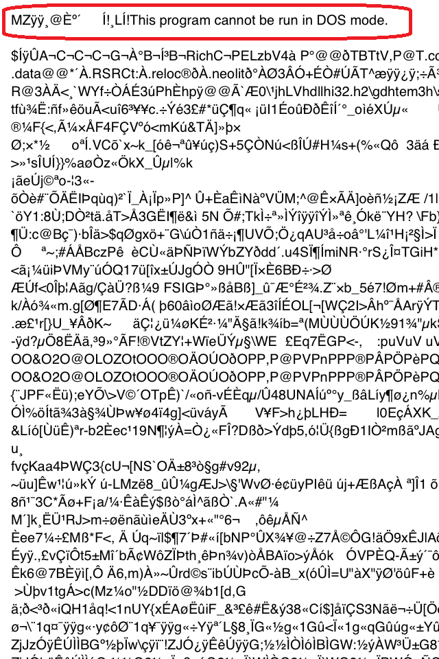Finalmente podemos ver el encabezado del archivo ” MZ” lo que nos dice que adentro trae un archivo ejecutable , por lo cual trae un código malicioso , un virus!